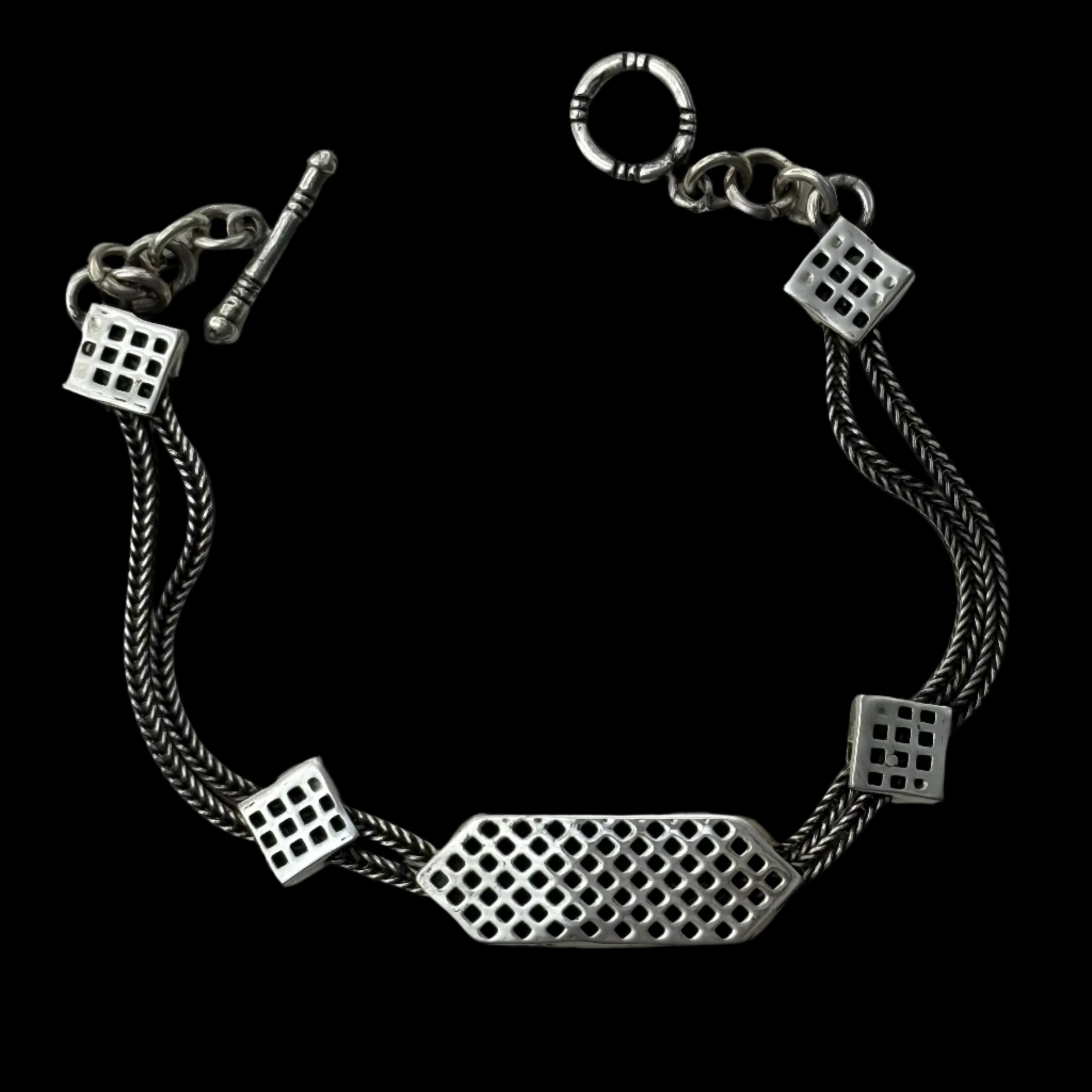 An elegant mixed-metal bracelet featuring intricate Arabic calligraphy on a brass hexagonal centerpiece. The piece combines oxidized silver chain with polished brass and silver geometric accents, creating a sophisticated blend of traditional script artistry and contemporary jewelry design. Complete with toggle clasp closure.