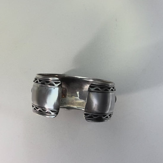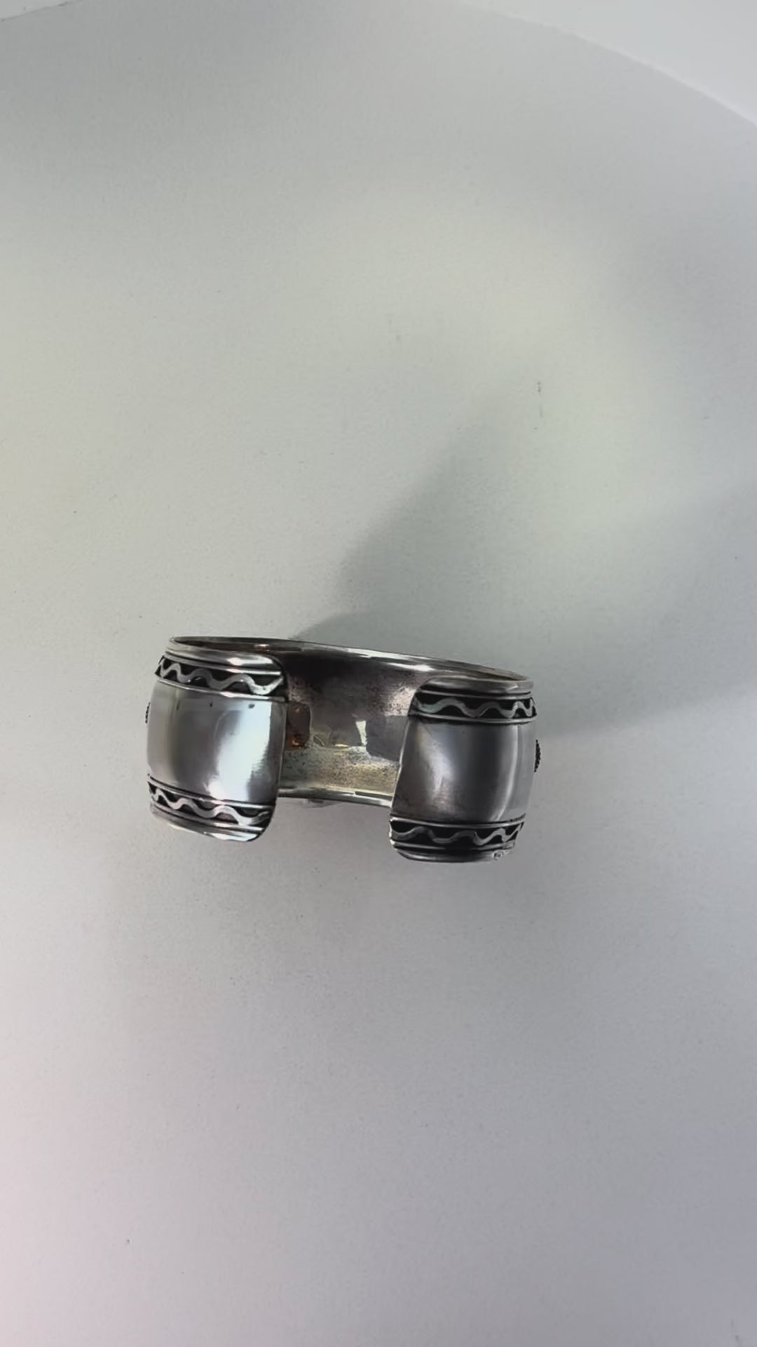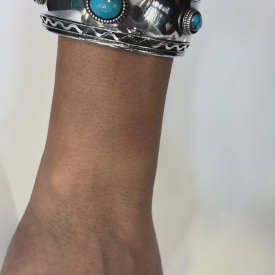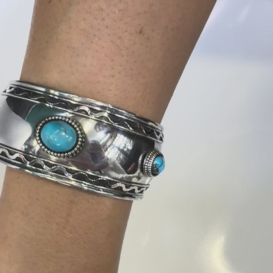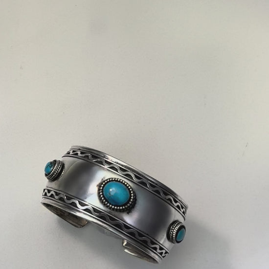 A bold silver cuff featuring three turquoise cabochons in beaded settings with intricate wave-pattern stampwork borders. The polished center band contrasts beautifully with the oxidized geometric detailing, creating a striking piece that blends traditional southwestern craftsmanship with modern style.